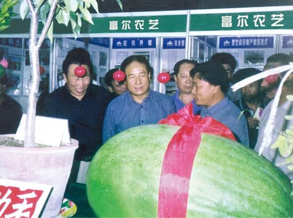 原吉林省省委书记王云坤在富尔农艺董事长张立的陪同下鉴赏富尔超大西瓜。