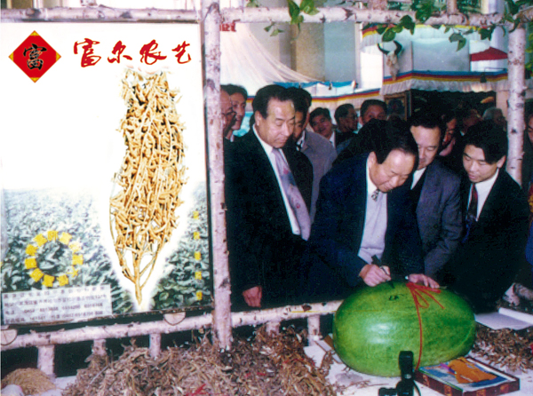 原全国人大常委会副委员长田纪云,在重达76.8公斤的“富尔宝霸”西瓜上欣然命笔“西瓜之冠”。
