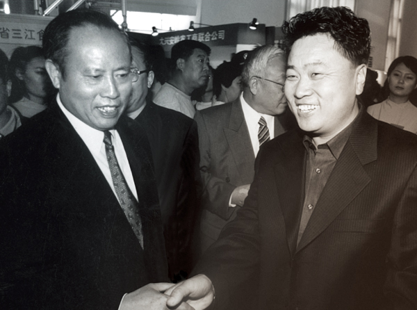 原黑龙江省省委书记徐有芳同齐齐哈尔市富尔农艺有限公司董事长张立亲切握手