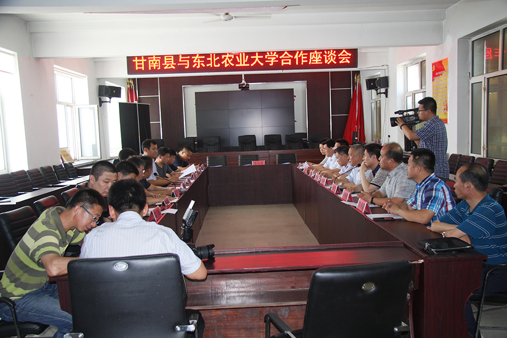 2017年7月10日,甘南县与东北农业大学合作座谈会暨富尔农艺、东北农大校企合作联合精准扶贫甘南县东阳镇东发村签约仪式,在甘南县东阳镇政府隆重举行。东北农业大学党委书记孙登林、东北农业大学组织部长解宗军、东北农业大学农学院党委书记衣春生、东北农业大学农学院院长邹德堂、东北农业大学校办副主任刘晓峰、东北农业大学农学院教授陈庆山、甘南县县委书记王书伟、甘南县农业局局长李斌、甘南县扶贫办主任申大庄、甘南县东阳镇党委书记何守海、甘南县东阳镇镇长付金明、甘南县东阳镇纪委书记吕鹏、甘南县东阳镇东发村第一书记精准扶贫工作队队长朱志猛、东发村精准扶贫工作队成员李其林、宁方勇,齐齐哈尔市富尔农艺有限公司董事长张立、齐齐哈尔市富尔农艺有限公司科研副总孙书库博士等领导出席会议,并参加了签约仪式。