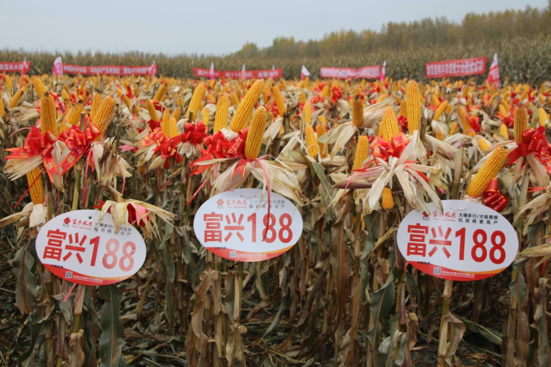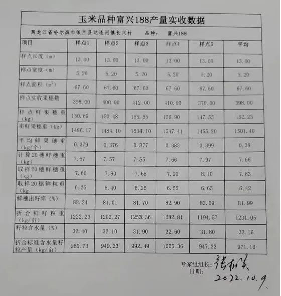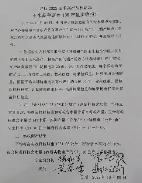10月9日,由中国种子协会主办的“2022年寻找玉米高产品种”活动中,富尔农艺的富兴188玉米新品种在哈尔滨市依兰县达连河镇长兴村种植280亩地块进行田间测产,折合14%的籽粒含水量平均亩产971.10公斤。
