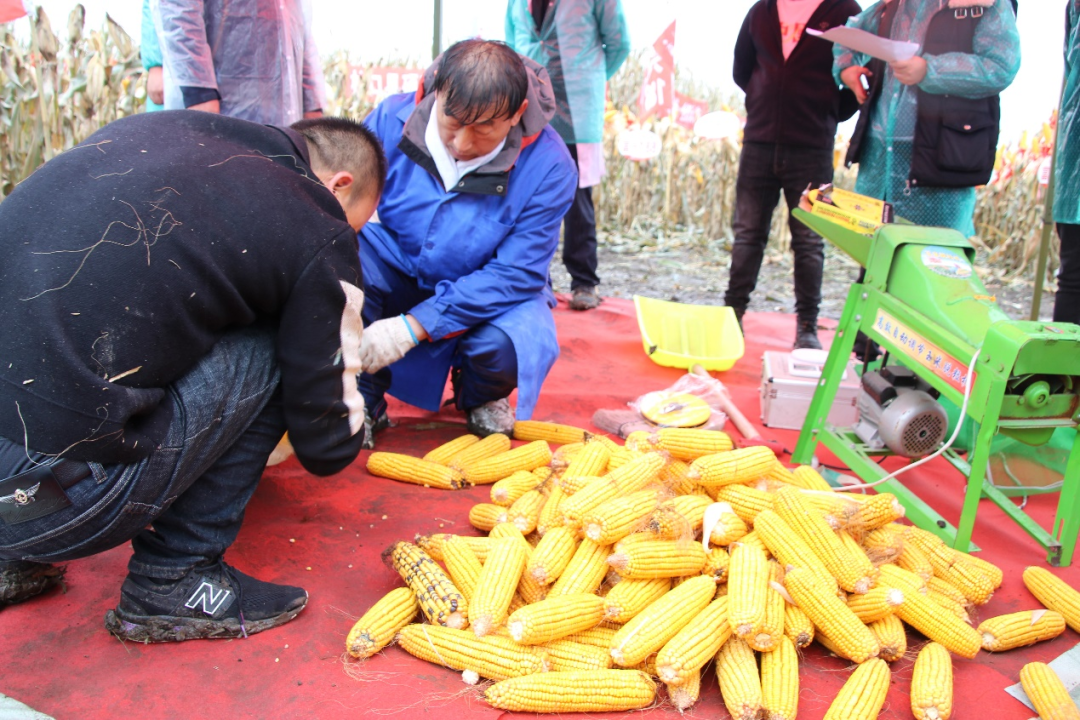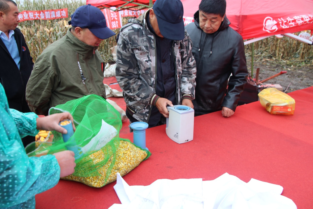 专家组根据农业农村部玉米专家指导组和全国玉米栽培学组共同制定的《关于玉米高产、超高产田间测产验收方法和标准》,对富兴188展开现场标准化的实收测产。在280亩富兴188示范田中随机选取30亩,采用5点取样法,每个点平均在67平方米以上,实测平均亩实收籽粒鲜重1231.05公斤,用“PM-8188”型谷物水分测定仪测定籽粒含水量,籽粒平均含水量32.16%,折合14%籽粒含水量计算,实测亩产971.10公斤。