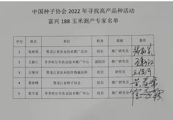 本次测产活动邀请了黑龙江省农业技术推广总站张相英推广研究员、黑龙江省种子协会黄春峰推广研究员、黑龙江省农科院作物栽培所王俊河研究员、齐齐哈尔市农业技术推广中心崔守富推广研究员、齐齐哈尔市农业技术推广中心王新江推广研究员担任本次测产活动测产专家。