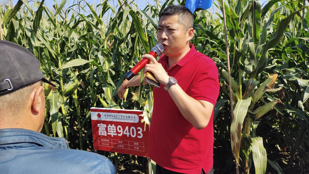注:富尔玉米公司副总经理卢敏华介绍“富单9403”玉米品种。