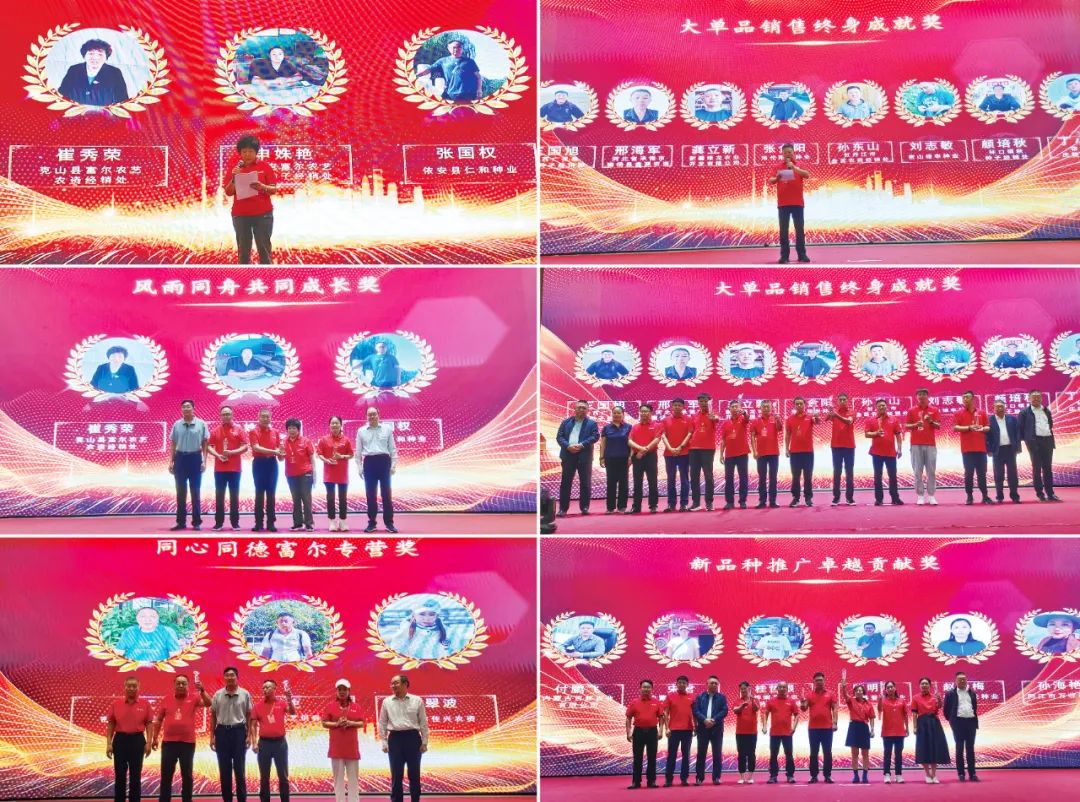 为了表彰多年来在各个地区为富尔产品推广工作做出突出贡献的优秀经销商,大会还举行了隆重的颁奖仪式。颁奖仪式上,邓光联副会长、黄春峰会长、韩淑湘副局长、王峰主任、张立董事长等领导先后上台为获得“风雨同舟共同成长奖”、“同心同德富尔专营奖”、“大单品销售终身成就奖”、“新品种推广卓越贡献奖”的获奖嘉宾颁发了荣誉奖杯。
