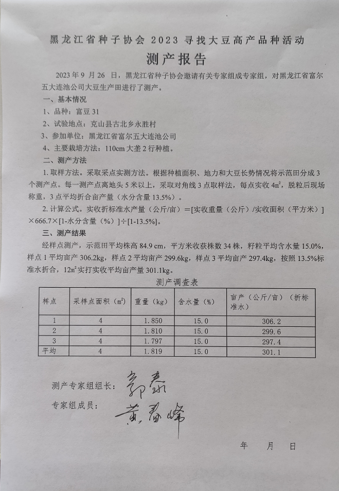 9月26日,根据中国种子协会主办的《2023年大豆高产创建活动》相关要求,由黑龙江省农业科学院郭泰研究员牵头成立了高产大豆新品种测产专家组,通过公开、公正和科学的方法进行千亩攻关田测产实收和结果评选,在众多参选大豆新品种中,富尔五大连池市农业科技公司的新品种“富豆31”打破了我国大豆千亩攻关田的高产新纪录,被评选为“2023年大豆高产创建活动明星品种”。