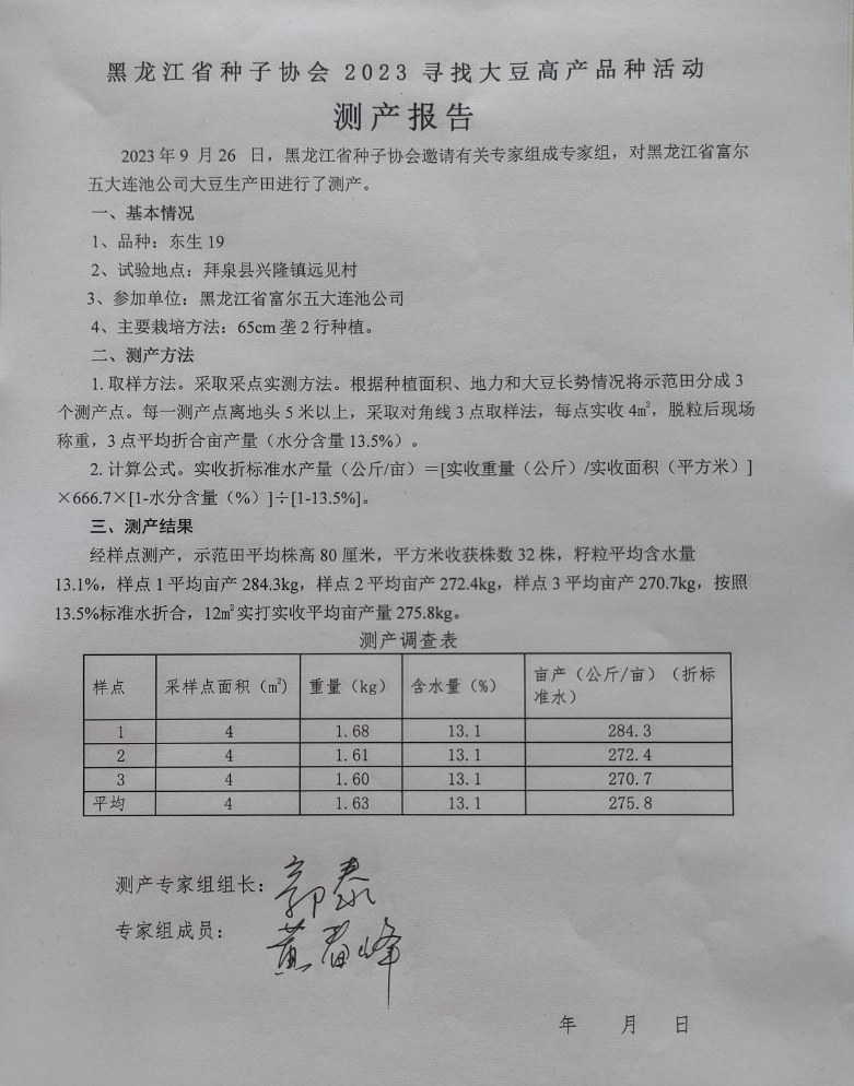 专家组采用净作大豆实收测产方法对拜泉县大豆高产攻关田内的120亩“东生19”大豆品种进行实地测产。经测定,扣除杂质,折合成标准水分(水分13%),最终亩产达到275.8kg,创造了我国大豆高产攻关新记录。