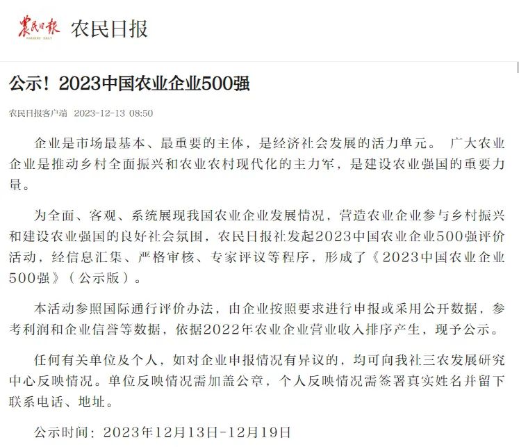 12月13日,由农民日报社发起的2023中国农业企业500强活动中,富尔农艺成功入选!