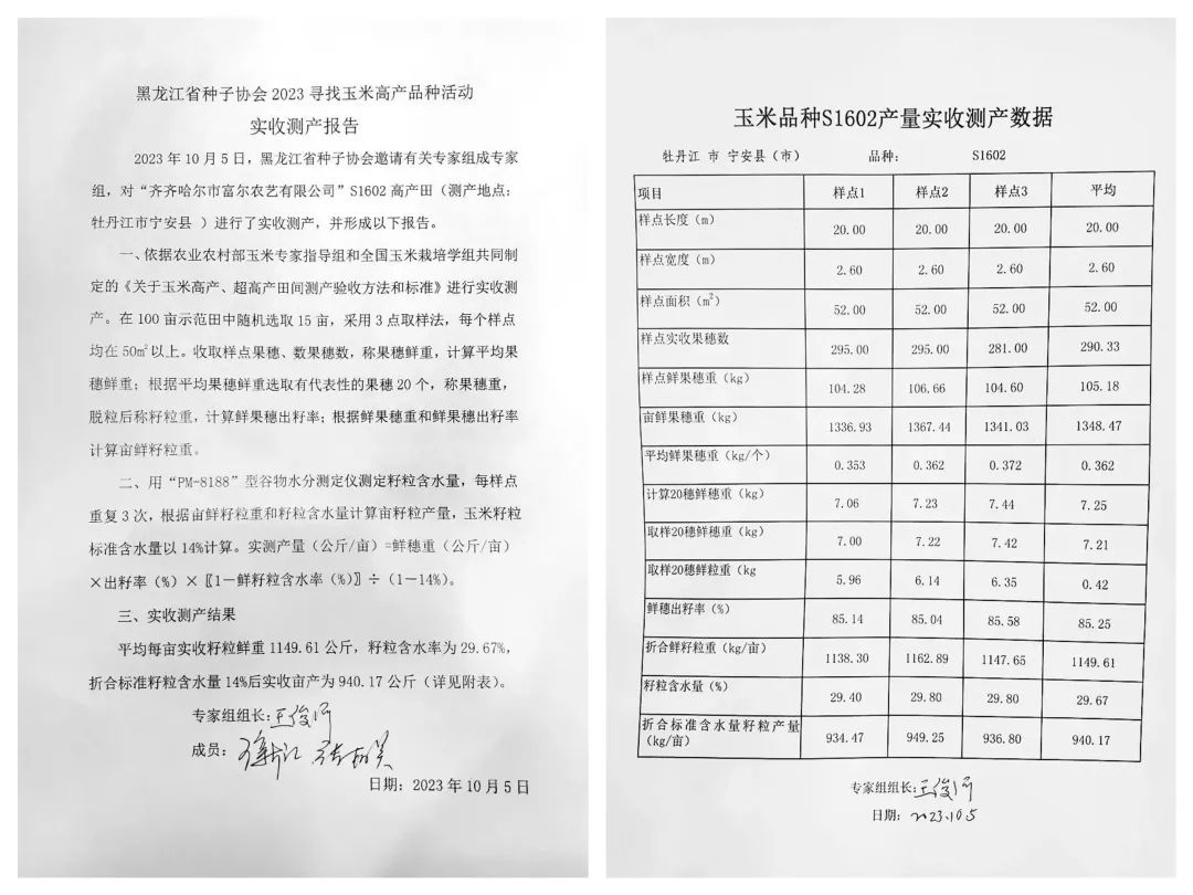 10月5日,由中国种子协会主办的“2023年寻找高产玉米高产品种”活动中,富尔农艺与中种国际合作玉米高产新品种“S1602”玉米在牡丹江市宁安市种植的100亩高产田地块进行专家现场田间测产,获得折合14%标准水分平均亩产940.17公斤的高产量,位列该组高产榜第一名。