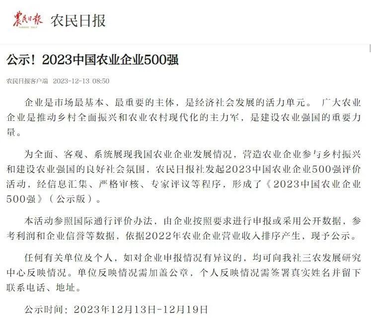12月12日,由《农民日报社》发起的2023中国农业企业500强活动中,富尔农艺成功入选!