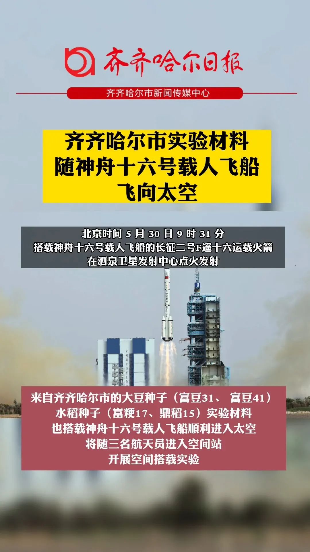5月30日9时31分,搭载神舟十六号载人飞船的长征二号F遥十六运载火箭在酒泉卫星发射中心点火发射,并取得圆满成功。其中由齐齐哈尔市老促会推荐的由齐齐哈尔市富尔农艺有限公司自主育成的大豆品种“富豆31”、“富豆41”和水稻品种“富粳17”、“鼎稻15”随神州十六号载人飞船一同升入太空进行太空辐射诱变育种。