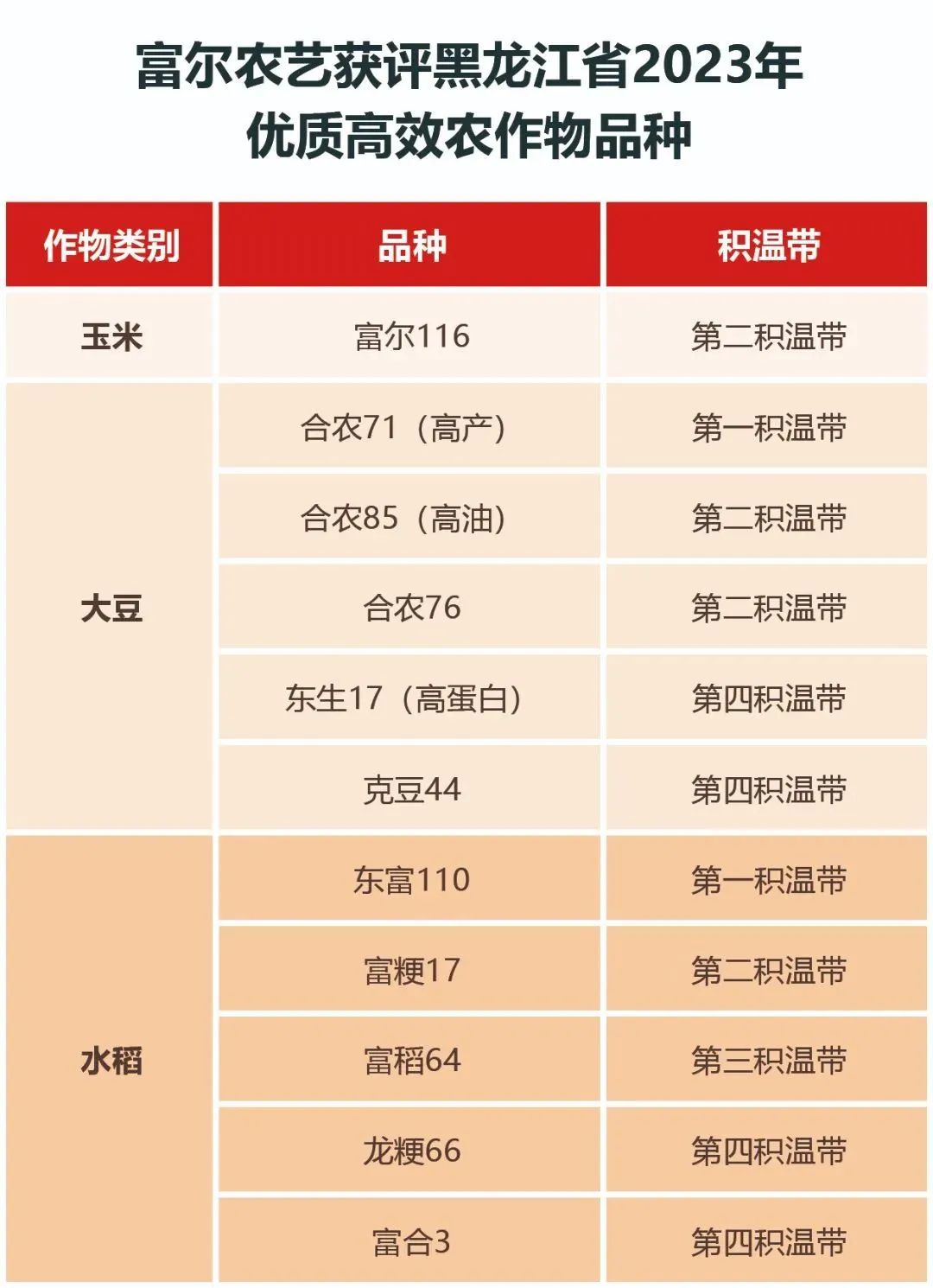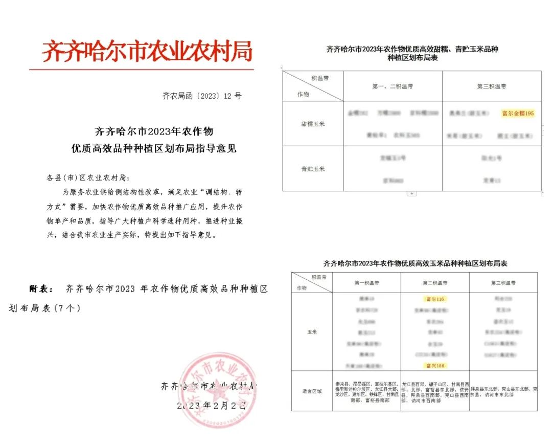 2月2日,齐齐哈尔市农业农村局发布文件《齐齐哈尔市2023年农作物优质高效品种种植区划布局指导意见》齐农局函〔2023〕12 号,文件确定了齐齐哈尔市2023 年农作物优质高效品种种植区划布局玉米、水稻、大豆、小麦主要粮食作物主导品种75 个;甜糯、青贮玉米主导品种13个;马铃薯主导品种21个;杂粮杂豆主导品种46个。其中,富尔农艺“富尔116”、“富兴188”、“富尔金糯195”玉米品种荣誉上榜,位列其中。“富尔116”、“富兴188”被指定为齐齐哈尔市2023年第二积温带农作物优质高效品种,“富尔金糯195”被指定为齐齐哈尔市2023年第三积温带农作物优质高效品种。