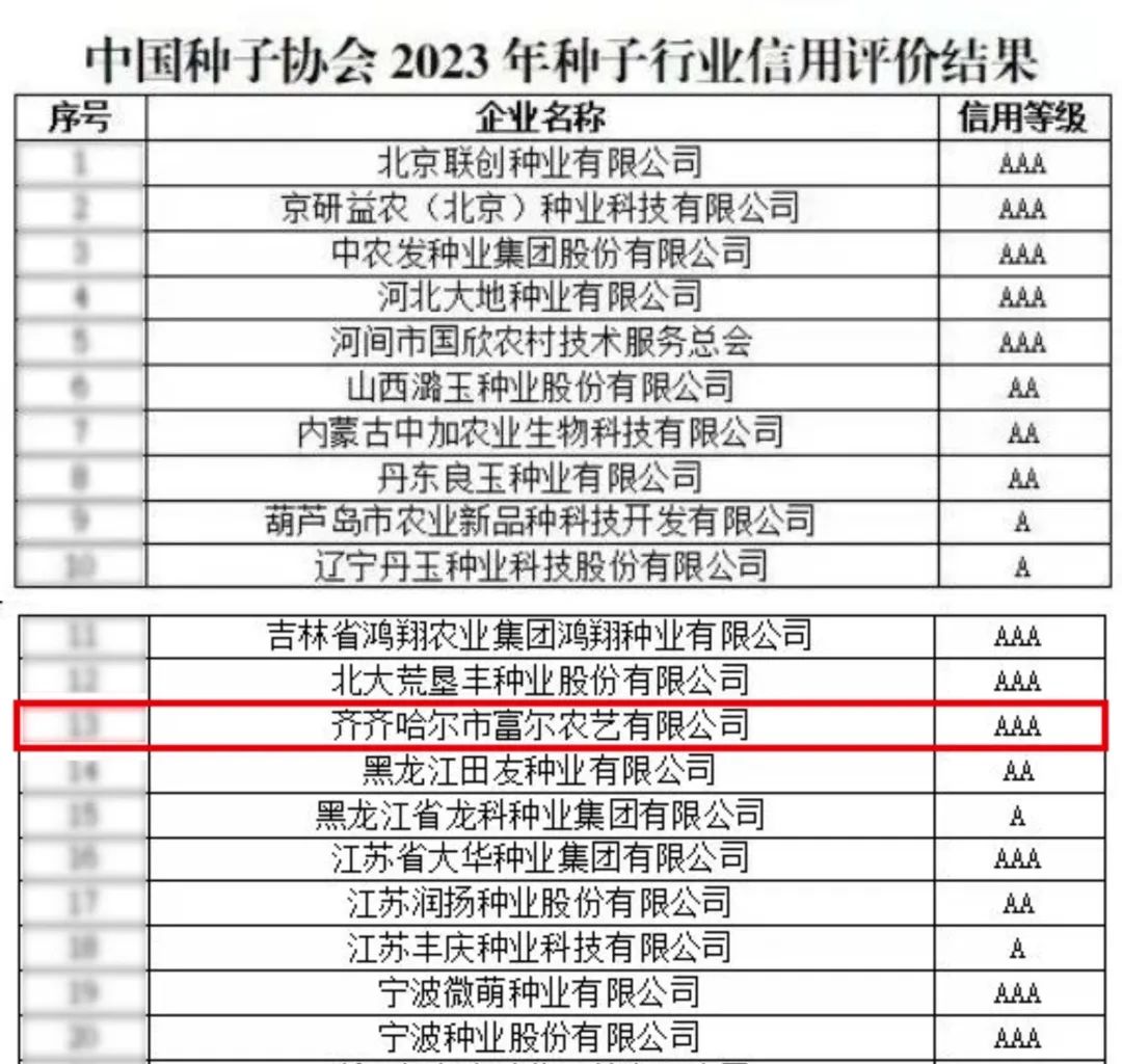 12月8日,中国种子协会发布文件《中国种子协会2023年种子行业信用评价结果公示》,齐齐哈尔市富尔农艺有限公司荣获“中国种子协会2023年种子行业信用评价AAA级信用企业”。