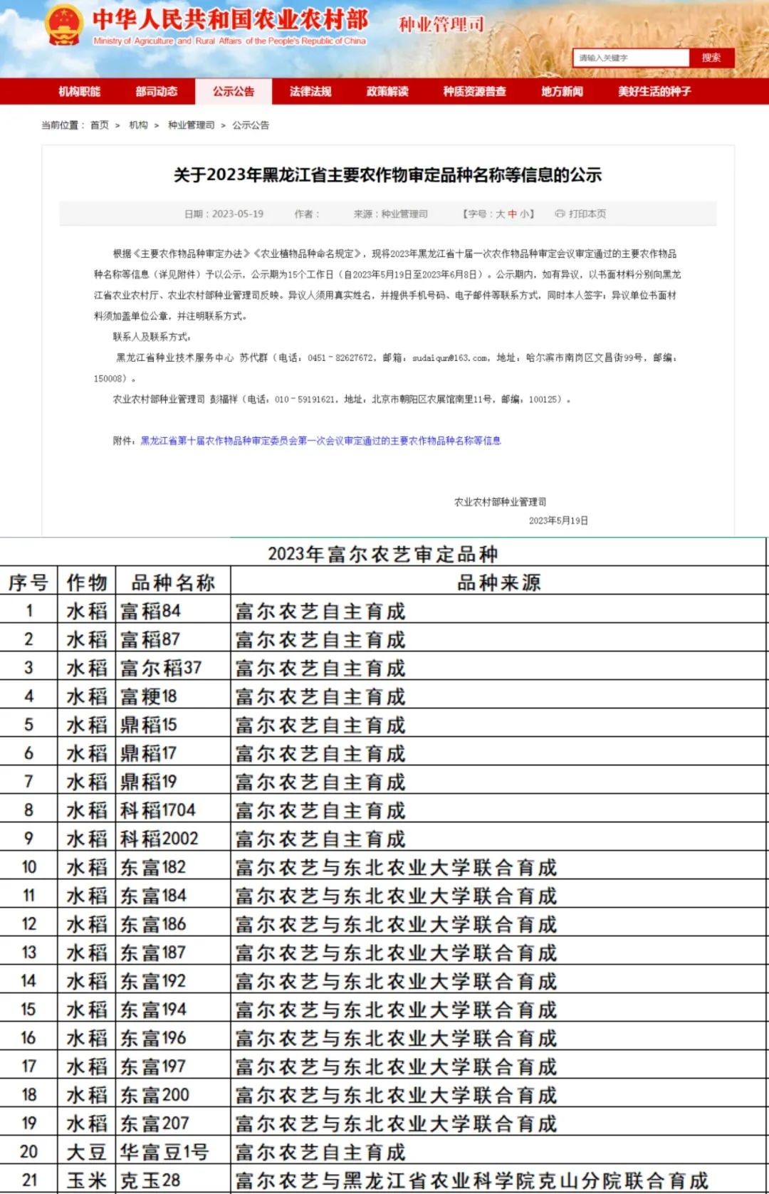 5月19日,农业农村部种业管理司发布了《关于2023年黑龙江省主要农作物审定品种名称等信息的公示》,21个品种通过省级审定。其中由齐齐哈尔市富尔农艺有限公司和黑龙江省富尔水稻研究院自主育成的“富稻84”、“富稻87”、“富尔稻37”、“富粳18”、“鼎稻15”、“鼎稻17”、“鼎稻19”、“科稻1704”、“科稻2002”,由齐齐哈尔市富尔农艺有限公司与东北农业大学联合育成的“东富182”、“东富184”、“东富186”、“东富187”、“东富192”、“东富194”、“东富196”、“东富197”、“东富200”、“东富207”等水稻新品种,由齐齐哈尔市富尔农艺有限公司自主育成的“华富豆1号”大豆品种,由齐齐哈尔市富尔农艺有限公司与黑龙江省农业科学院克山分院联合育成的“克玉28”玉米新品种顺利通过黑龙江省十届一次农作物品种审定会议审定。