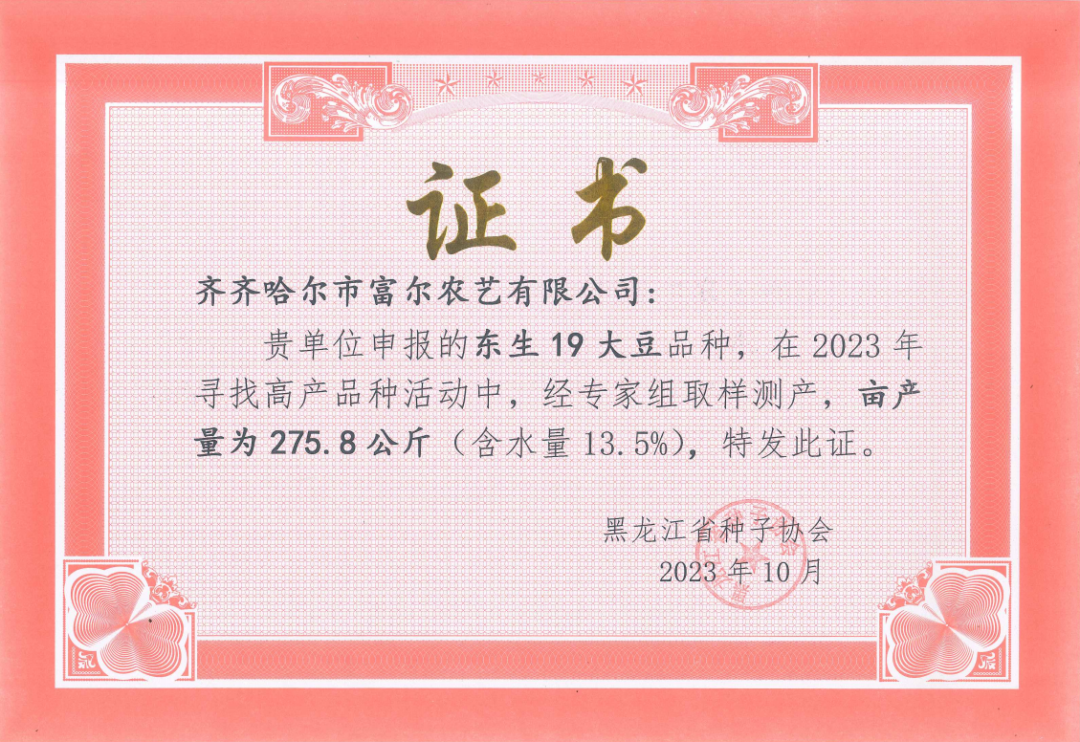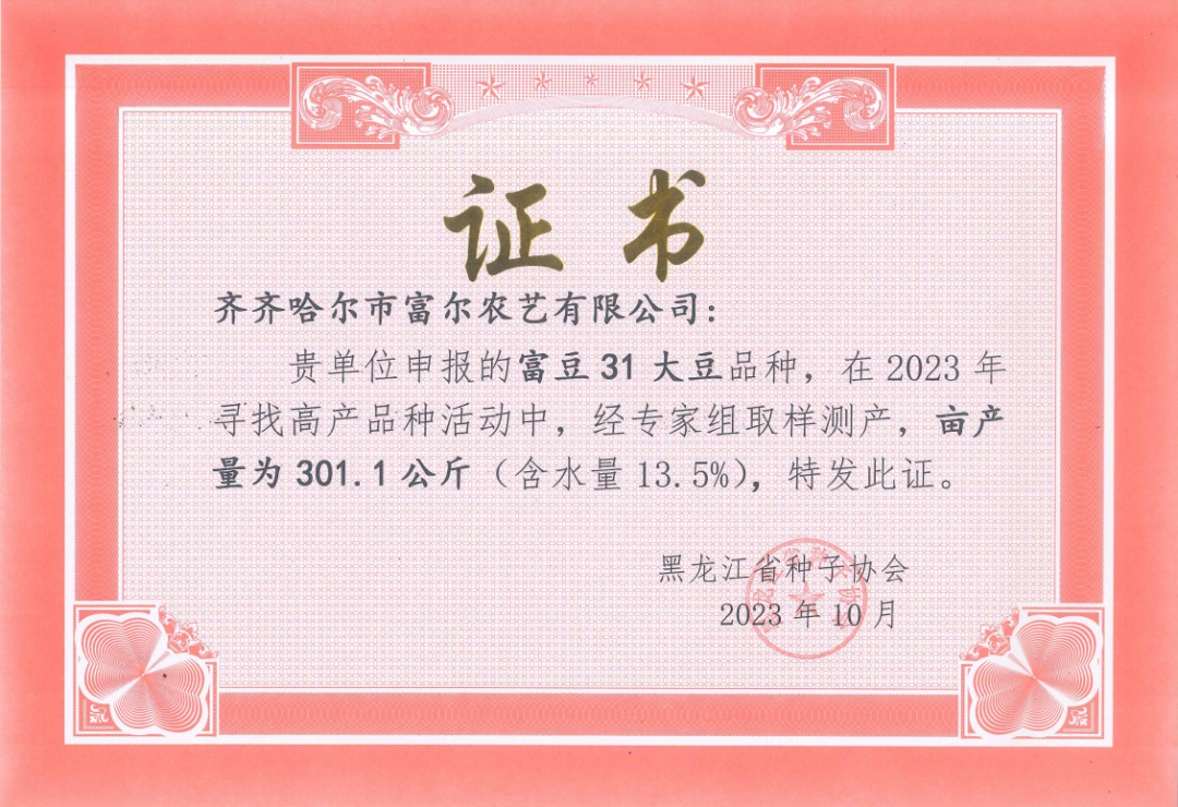9月26日,根据中国种子协会主办的《2023年大豆高产创建活动》相关要求,由黑龙江省农业科学院郭泰研究员牵头成立了高产大豆新品种测产专家组,通过公开、公正和科学的方法进行千亩攻关田测产实收和结果评选。在众多参选大豆新品种中,富尔五大连池市农业科技公司的新品种“富豆31”打破了我国大豆千亩攻关田的高产新纪录,被评选为“2023年大豆高产创建活动明星品种”。
