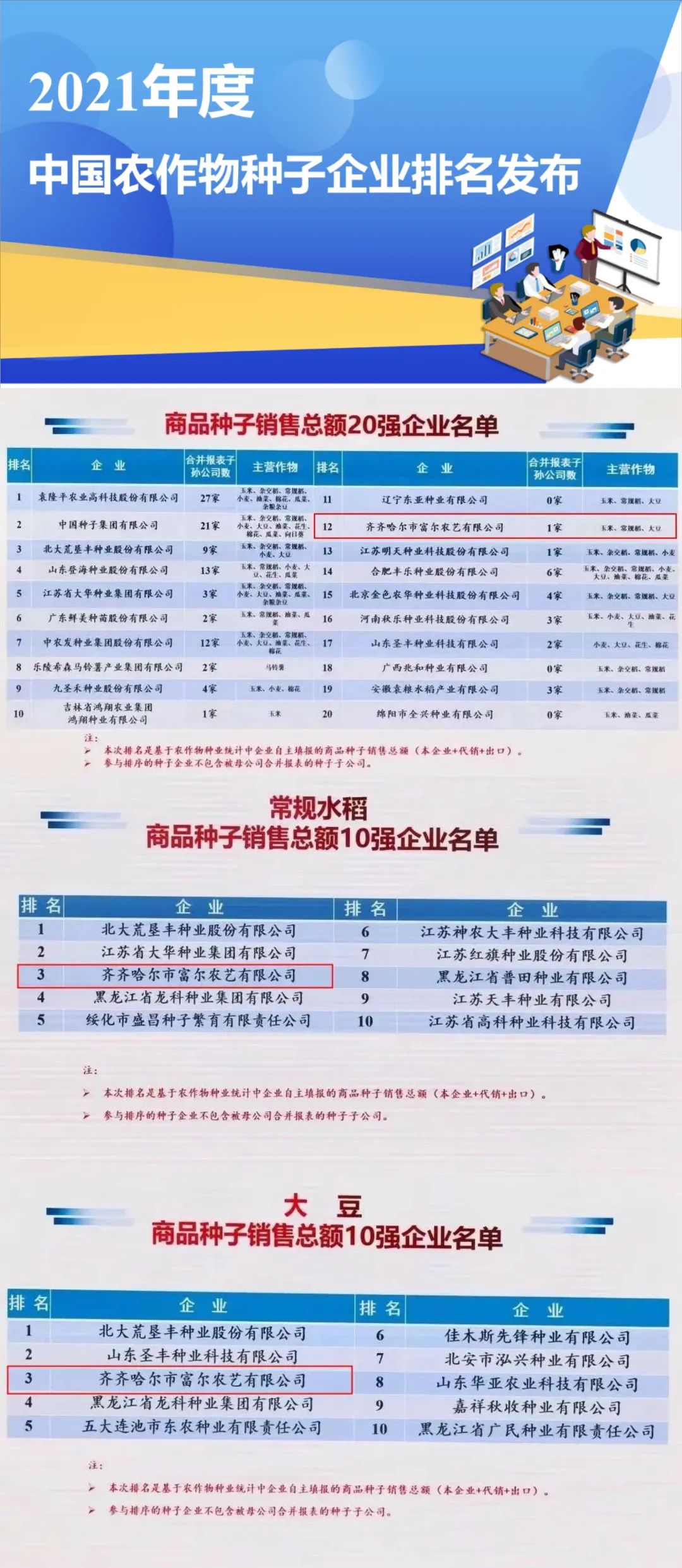3月18日,第十四届中国国际种业博览会暨第十九届全国种子信息交流与产品交易会在天津市隆重开幕。大会期间,举行了推进种业振兴信息发布会,会上发布了2021年度中国农作物种子企业销售排名和各主粮作物销售排名等,其中富尔农艺荣获了全国商品种子销售总额第十二名,全国常规水稻商品种子销售总额第三名,全国大豆商品种子销售总额第三名的好成绩。