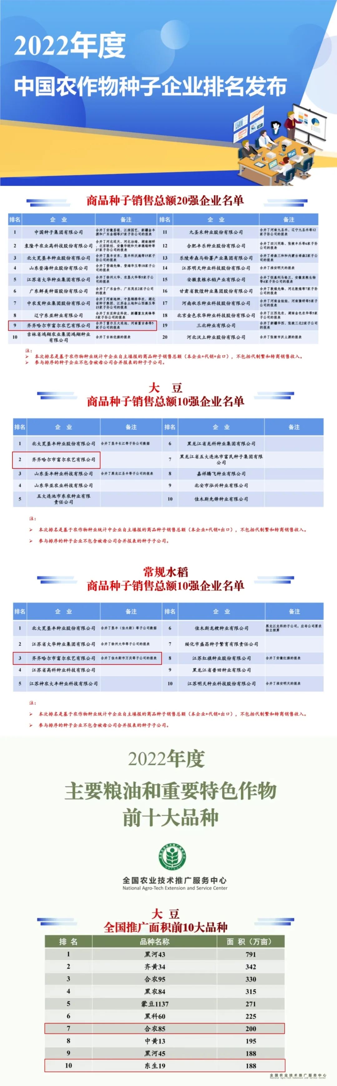 9月24日,第二十届全国种子信息交流与产品交易会上发布了2022年度中国农作物种子企业销售排名和各主粮作物销售排名。其中,富尔农艺分别荣获了全国商品种子销售总额第九名(同比提高了3个位次),再次进入全国种业销售榜前十名榜单;又荣获了全国大豆商品种子销售总额第二名(同比提高了1个位次);还荣获了全国常规水稻商品种子销售总额第三名。并且,在大豆全国推广面积前十大品种中,富尔“合农85”大豆全国推广面积200万亩,位列第七名;富尔“东生19”大豆全国推广面积188万亩,位列第十名。