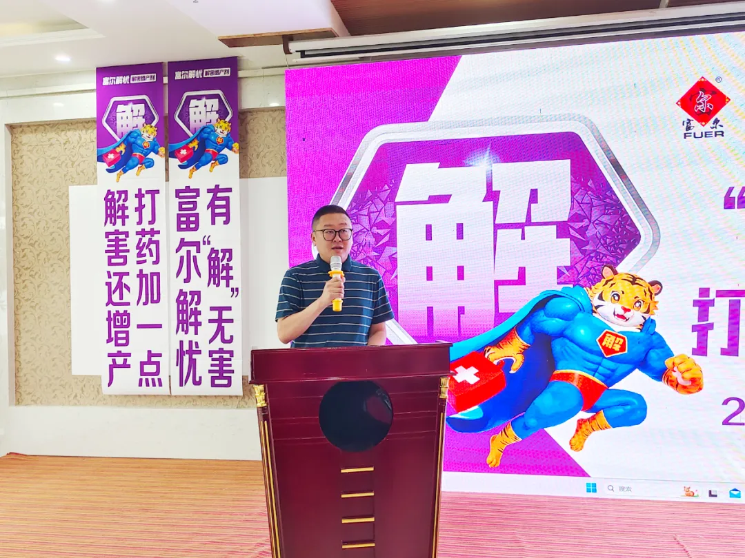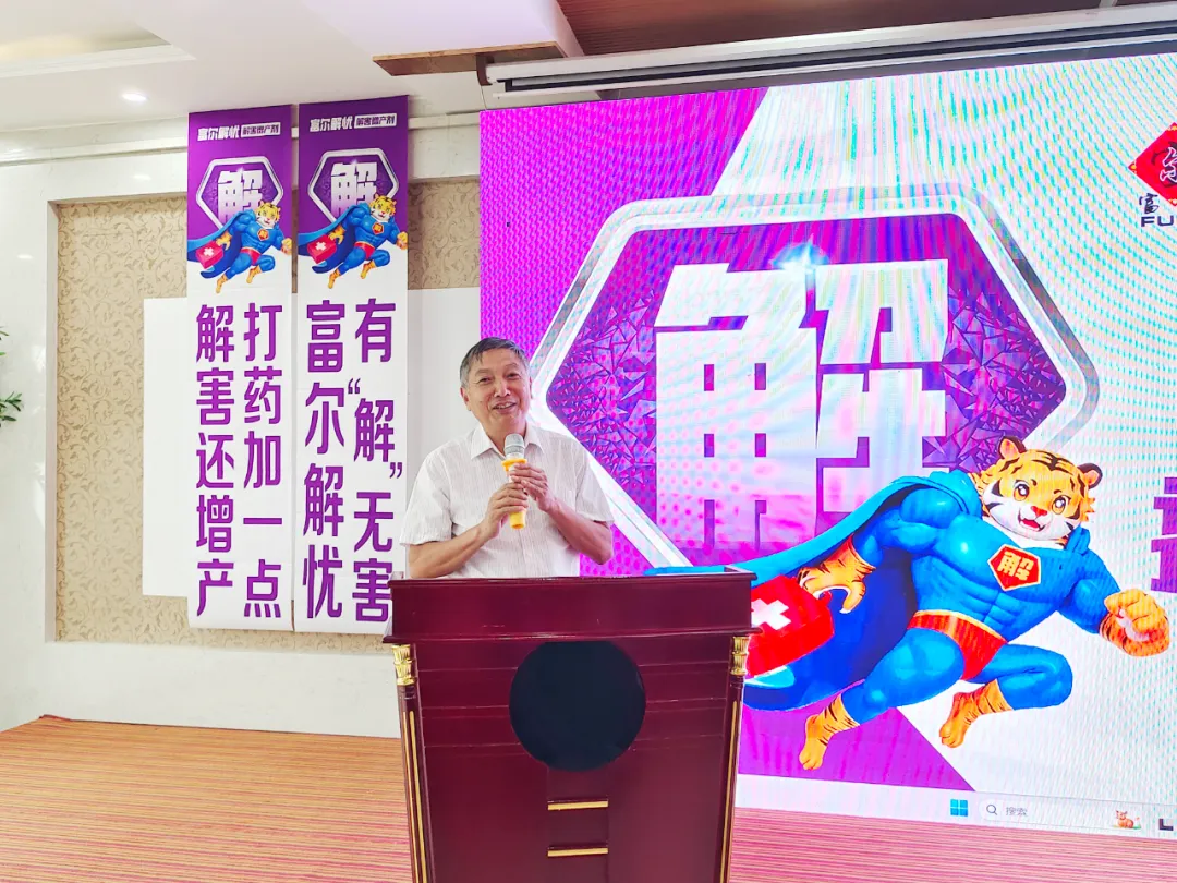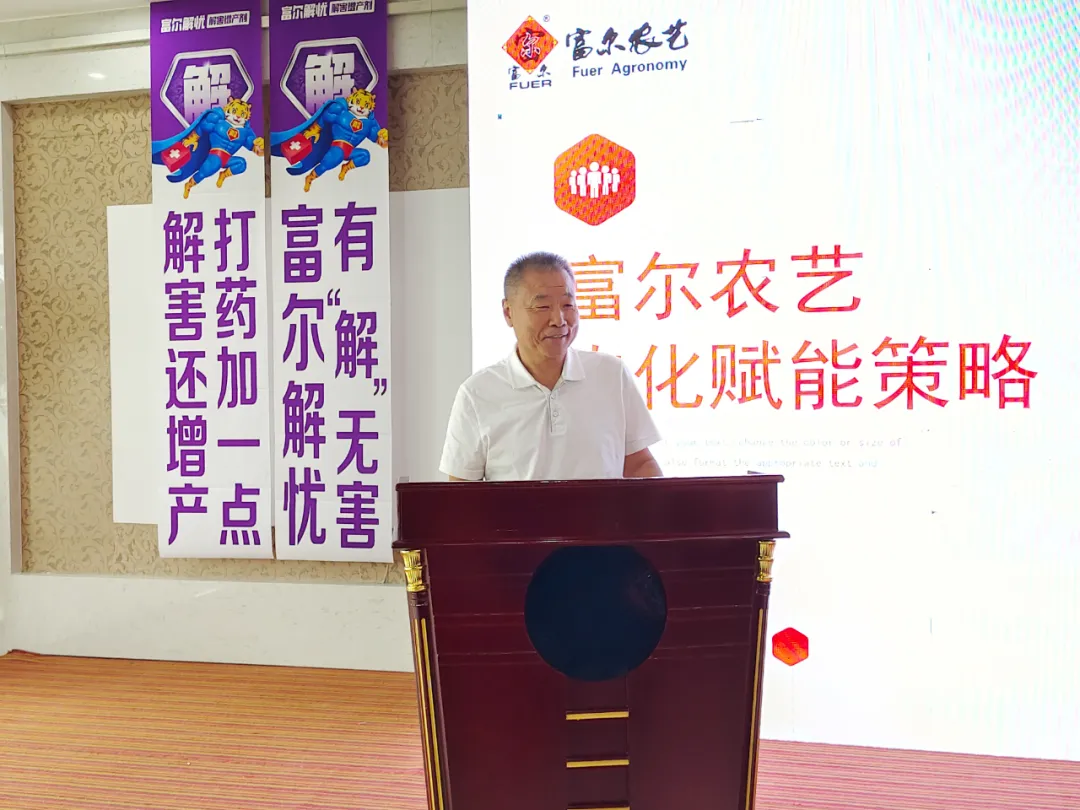 会上,富尔农艺董事长做了题为《富尔农艺农化赋能策略》的主旨报告。他表示,富尔农艺三十年前打造的叶面肥爆款产品富尔655以其经典的广告语“富尔655,荒山变沃土”和卓越的产品效果风靡神州大地,助力富尔快速跻身种业国家队并发展至今。在种植安全备受关注的当下,富尔农艺矢志不渝蓄力农化,发挥品牌和底蕴优势,推出了富尔“解忧”中微量元素水溶肥,以满足当下农民稳产增收的渴求。我们将在做好种业的基础上,打通农化研发、推广上下游,从十个方面深度赋能做好农化,一是品牌赋能,我们要邀请具有公信力的奥运健儿作为代言人,打造央视上榜品牌,形成品牌美誉度和知名度提升。二是技术赋能,富尔农化已经与国内头部科研单位建立了紧密的合作关系,力争将更多具有市场穿透力的农化产品陆续投放市场,形成市场代差优势。三是政策赋能,富尔农艺作为全国经营规模第九名的种子企业,已经完成了资本的原始积累,现在具备更多资源要素可以调动助力富尔农化的跨越式发展,未来会在方方面面都向农化业务线给予更多政策倾斜,富尔农化的地位在集团层面逐步上升。四是协同赋能,因为富尔农艺在三大主粮方面已经具备市场竞争的领先优势,通过主推产品的农化套餐叠加,已经具备了在广大种植户层面的绝对影响力,促使经销商朋友们可以实现一“人”通道触达更多产品,形成更多销售。五是设计赋能,富尔“解忧”邀请了专业的设计公司,针对性地进行了VI设计,产品、外包装、宣传语独具一格,形成了眼球效应。六是爆品赋能,富尔农化依托南京农大等头部科研院所,打造了一批“解忧”、“稳多金”等具有市场穿透力的爆品,助力经销商朋友们抢夺高端种植户更多的市场份额。七是服务赋能,目前富尔农化打造了以国家二级研究员刘福齐老师领衔的农艺服务团队,以中农福鼎团队为支撑,进行全省覆盖的农时田间地头回访服务和技术指导。八是模式赋能,目前富尔农化已经联合沈阳朗润传媒,开创AI数字化人宣传的新模式,进行24小时不间断的短视频和直播投放,加强与种植户的问题交流解决和技术指导,不断强化C端(种植户)的粘性。九是营销赋能,我们开创了SAVE营销新模式,针对不同经销商,不同市场,不同种植户群体,出台各具特色的营销方案,手把手的指导、支持经销商做大做强的同时,强化经销商的服务和推广能力。十是利润赋能,目前富尔农化通过顶尖科技的加持,向市场释放的都是一批呈现高科技、高价位、高回报的产品,定位的就是助力C端种植大户实现高收益,助力经销商享受高科技的利润红利,更要让种植户形成科技增产增收的意识,通过高科技、高价位、高回报的正向产品需求链条,助力下游经销商体系和种植户朋友实现增收致富。