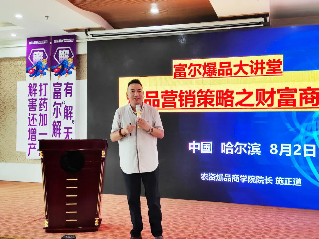 会上,道聚咨询董事长、农资爆品商学院院长、农资爆品营销专家施正道做了题为《富尔爆品大讲堂,爆品营销策略之财富商机》的主题报告。他指出,农资行业面临十大趋势,一是大型农药厂与大肥企业的品牌化运营及现代化设备的应用继续加大力度,二是特色原料与特色原药企业的优势继续存在,三是特肥赛道会继续涌现出新宠儿来加剧市场竞争力,四是大农户、大农场主的不断出现与飞防的大面积应用,五是农资爆品、大单品的狂轰乱炸会继续愈演愈烈,六是线上与线下相融合新营销模式会得到广泛使用,七是农资会销势头会继续加猛(种子),八是农资电商直播带货的头部网红会继续火爆,九是会有更多没干过农资的人加入这个行业,十是农资行业以作物为靶标的产品、展会及农资课程培训会继续热度不减。针对当前的农资行业发展趋势,大用户的科技意识和体验感正在逐步加强,因此,对于有资源、有危机意识的厂家和农资经销商,需要跳出低级混战层,占领大用户体验感打造爆品至关重要!结合当下短视频风口强化打造互联网+、强化个人IP打造,爆款产品富尔“解忧”的打造正符合当下趋势和潮流,富尔“解忧”爆品不单单是一个产品,更是一种好资源、一种好模式、一种好人脉、一种好变现。
