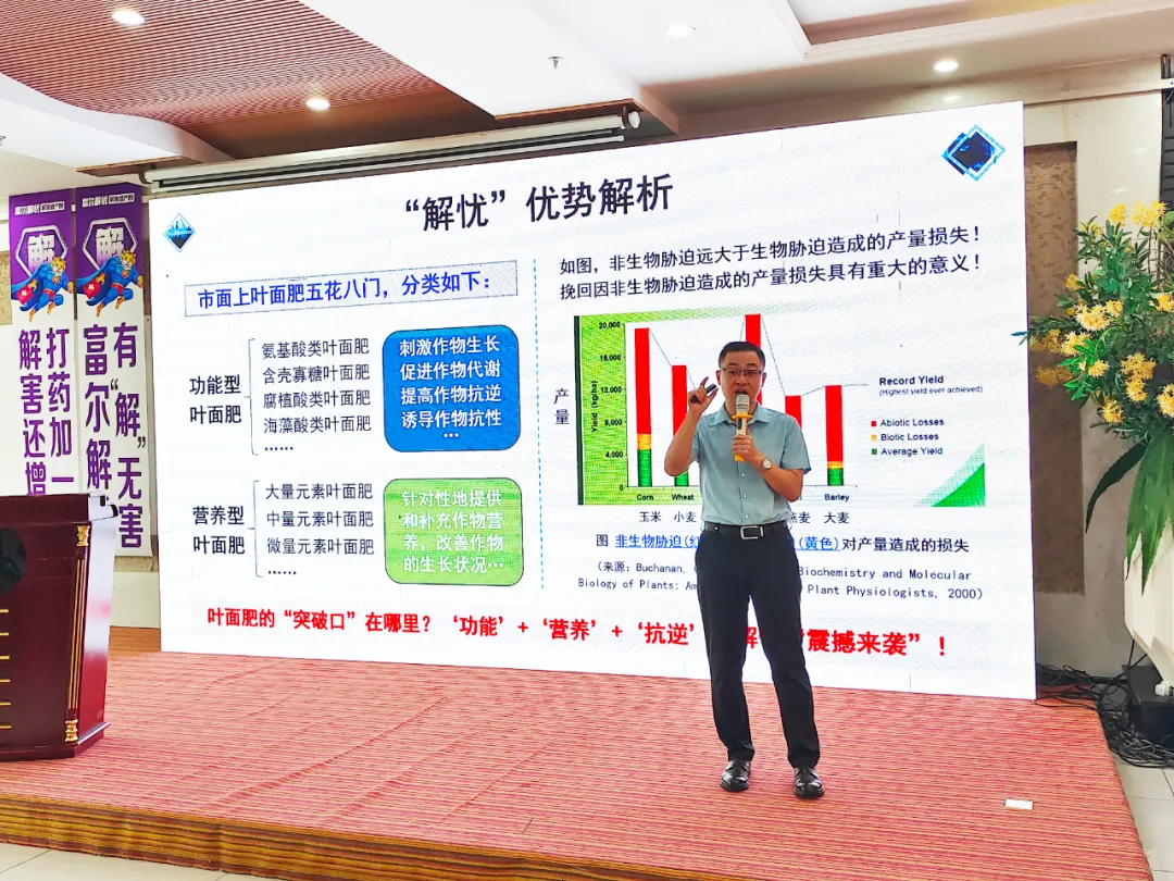 会上,富尔农化研发工程师吕星光做了题为《解害增产剂富尔“解忧”应用原理》的主题报告。报告从“解忧”产品研发背景、产品介绍、优势解析、使用技巧四个方面展开,他介绍,当前,我国农作物大量元素氮、磷、钾、碳、氢、氧普遍不缺甚至过量,而中微量元素当季则普遍缺乏,影响严重,其中,中量元素钙、镁、硫已经成为主要限制因子之一。而富尔“解忧”正是基于此,采用富尔千斤顶FRM免疫诱抗技术,添加钙、镁、多肽酶等活性成分协同互补的中微量水溶肥料。具有一解即缓解药害、肥害、冷害等逆境伤害,满足“解忧”诉求。二调即调营养功能,促进生长发育,调修复功能,修复受损细胞。三养护即养护叶片光合功能,养护茎秆强韧健康等解害、调理、养护、增产的功效!具有三大功效,一是预防和减轻除草剂药害,苗后除草时使用“解忧”,能预防或减轻除草剂对作物产生的药害,并壮苗生根。二是缓解药害和肥害,当农作物发生药害、肥害时,使用解忧可消除或缓解药害、肥害造成的叶片黄化、根系发育不良等问题。三是抗逆又营养,使用“解忧”能协肥或协药增效,在有效提高作物抗逆性的同时,补充作物必需营养元素。富尔“解忧”的优势在于非生物胁迫远大于生物胁迫造成的产量损失,挽回因非生物胁迫造成的产量损失具有重大的意义!他实现了“功能+营养+抗逆”三位一体,解决了用户的药害、肥害和产量之忧。