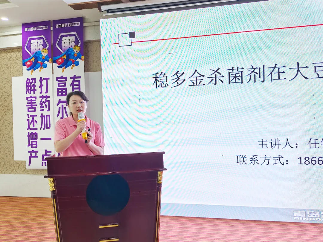接下来,瀚生生物产品研发部任锐玲老师做了题为《稳多金在大豆上的特殊功效》的主题报告。她介绍,“稳多金”是基于当前大豆主要病虫害即大豆菌核病、大豆根腐病、大豆灰斑病、大豆炭疽病、大豆霜霉病、大豆病毒病、红蜘蛛、食心虫等的防治而研发的一款产品。具有防病、提质、增产等多重功效。通过多年的推广试验和农民使用效果调查,对黑龙江大豆主产区的大豆病虫害防治效果突出,对大豆的品质提升和产量提升效果明显。