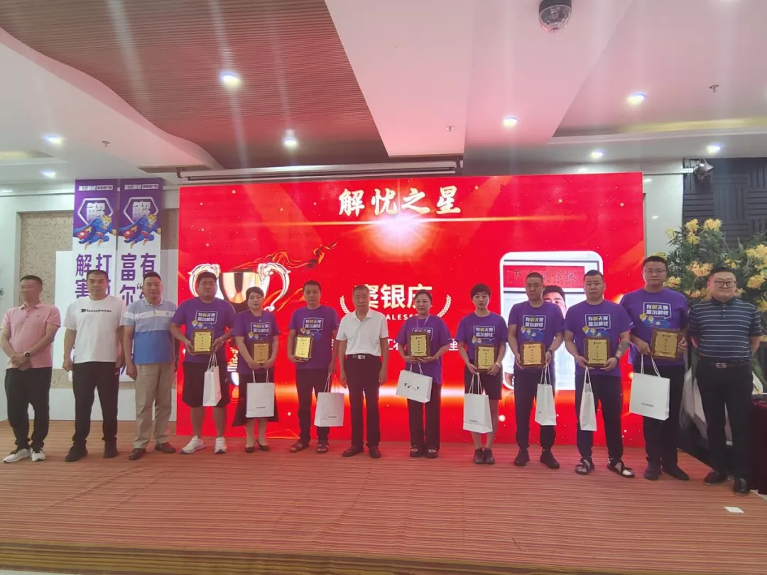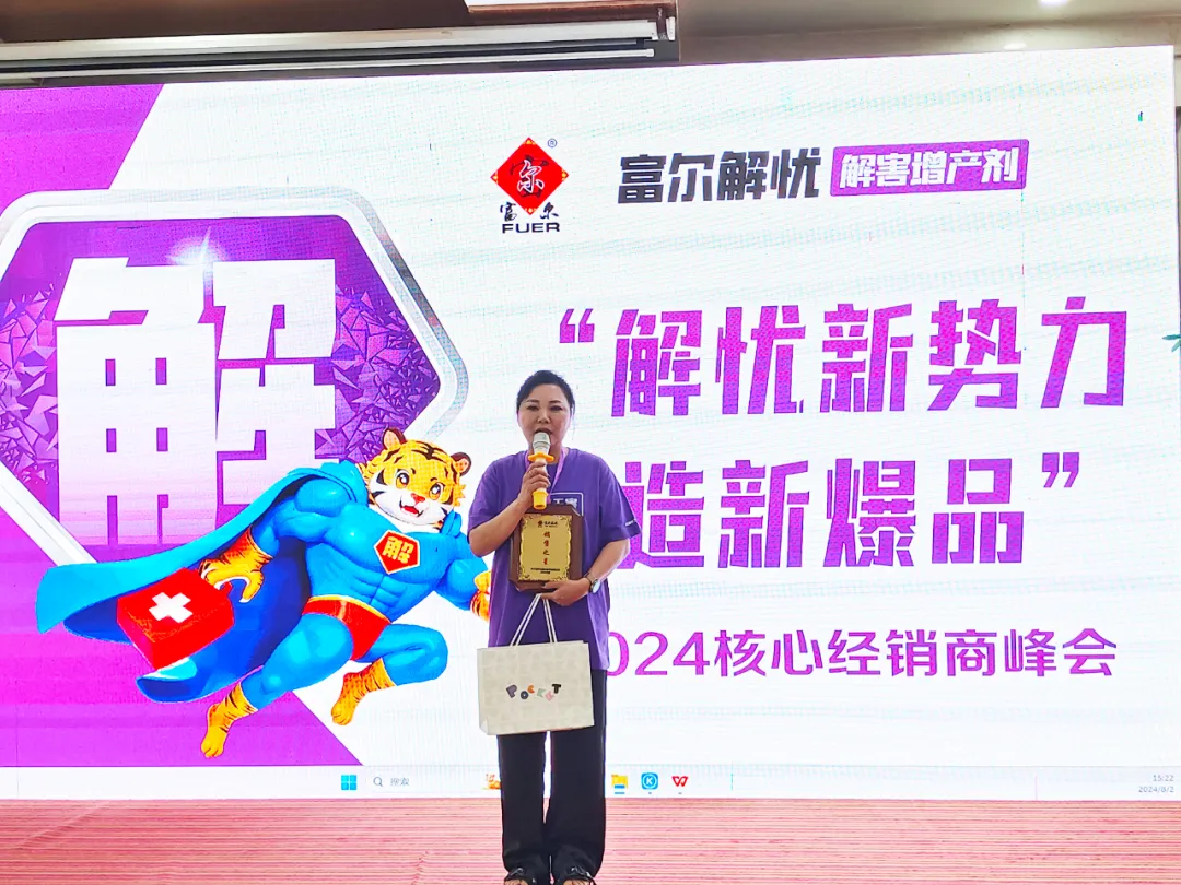 会上,为了表彰2024年度为富尔“解忧”推广工作做出突出贡献的优秀经销商,大会还举行了隆重的颁奖仪式。颁奖仪式上富尔农艺董事长张立、监事会主席邵习东、副总经理张鑫、副总经理张天罡等领导先后上台为获得“销售之星”奖、“解忧之星”奖、“明日之星”奖、“推广之星”奖的获奖经销商颁发了奖品和荣誉奖牌。