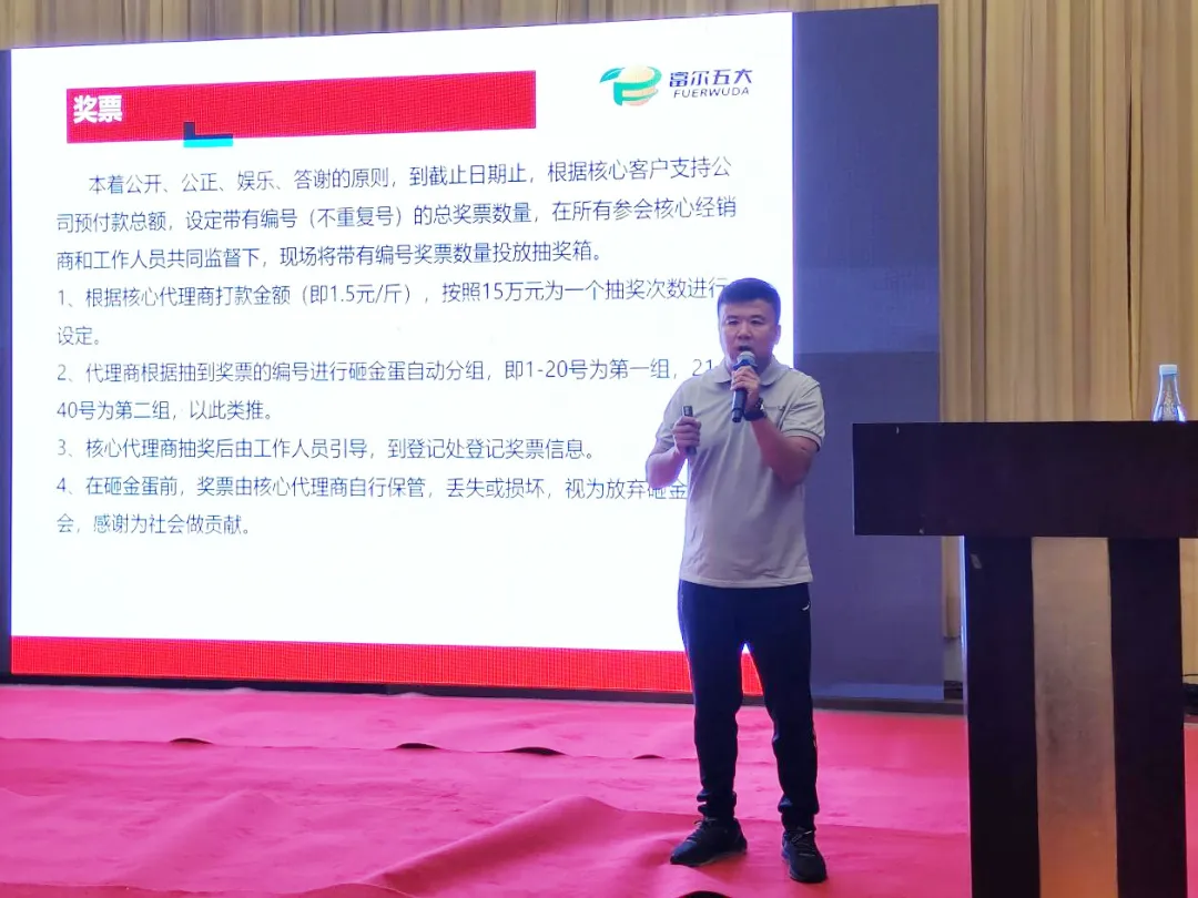 注:富尔五大公司副总经理赵春龙讲解会议抽奖中奖原则。