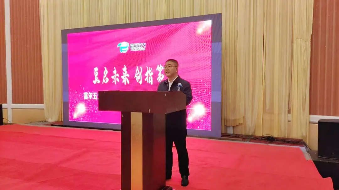 会上,富尔五大连池市农业科技发展有限公司总经理孙儒杰代表公司做了热情洋溢的欢迎致辞。他表示,我们要感谢所有核心经销商合作伙伴朋友们,因为富尔五大大豆产业是在所有核心经销商合作伙伴的鼎力支持、聚合发力下,才能取得全国大豆商品种子经营规模排名第二的历史佳绩。2025年销售即将开局,在开局前,我们定下了“豆启未来,剑指第一”这样一个宏伟的目标。为了实现这个目标,我们富尔五大公司做了一系列的谋划,但是,这个目标的实现,除了我们的精心谋划,更重要的是需要我们同心同德、步调一致、协同发力,方能再上台阶,实现新跨越。多年的合作使我们富尔五大公司与在座各位结下了亲如家人的深厚情谊,我坚信,一群人、一件事、一条心、一定行。在我们大家的团结努力下,没有什么事是干不成的,“豆启未来,剑指第一”的奋斗目标在我们富尔五大公司和全体核心经销商合作伙伴的团结努力下一定会圆满达成。