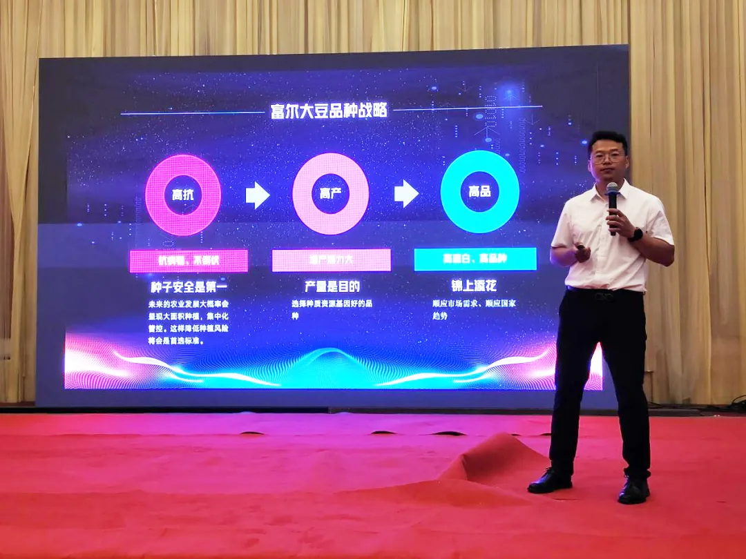 会上,富尔五大连池市农业科技有限公司总经理孙儒杰做了《富尔五大大豆产品线“亮剑”行动》的主旨报告。报告从设计育种、技术领先、对外合作、产品矩阵四个方面展开。他表示,在设计育种方面富尔五大针对我国大豆需求规模大、产业链长、对外依存度高的现实窘境,逐步加强了种质资源收集、保护和开发利用。据统计“富尔农艺作物种质资源库”现保存寒地大豆种质资源 4815份,核心骨干资源 400 余份,基本实现自主可控,并多次被国内知名育种单位高频引用,已经育成苗头性大豆新产品不下20余个。并利用高通量分子鉴定技术,逐步扩大了大豆资源优异育种性状的精准鉴定范围,在分子水平上逐步摸清了我国寒地大豆种质资源家底,并筛选出一大批优异大豆种质资源用于大规模生产应用,凸显了富尔五大大豆研发的“芯片”优势,并借助2个牵头联合体,4个试验站,分布在黑龙江和内蒙的40个测试点,加速筛选出符合市场各类细分需求的大豆产品,再通过全国384个经销商,加速最新,最优的新品导入速度,加大推广力度。富尔五大一直保持着科研经费600-800万元/年的投入力度,科研试验田230亩,这也是富尔五大持续产出产品的重要保障。富尔五大按照国际种子企业商业化育种架构,遵照“标准化、程序化、信息化、规模化”要求,建立起“工厂化、分段式”育种创新流程,实现信息与资源高度共享,保障了育种创新工作的深入开展和规模化产品矩阵研发,促使大豆产品选育由“偶然”向“必然”的越阶。从选择最好的品种到设计最好的品种,富尔五大,做足了准备。在技术领先层面,富尔五大通过群体选系、群间测配的方式,利用DH技术、基因芯片、表型技术和育种算法,实现基因组育种应用,已经成功筛选出“富豆”、“富中豆”、“富农”、“华富豆”等系列具有自主知识产权的以“高油高产和高蛋白高产”为显著特征的当家产品,有力的奠定了优异亲本和骨干材料基础,逐步提升了我国大豆商品的市场竞争力,基本实现了从大豆种质资源源头创新构建了大豆商品力。在对外合作方面,富尔五大先后与黑龙江省农科院,黑龙江省农科院黑河分院、佳木斯分院、克山分院、齐齐哈尔分院、绥化分院,黑龙江省农垦科学院、九三所等省内科研机构开展了常规育种合作;与中国科学院东北地理与农业生态研究所、中国农科院作物研究所开展了省外常规育种合作;与大北农生物技术中心、隆平生物、先正达生物中心开展了转基因技术合作;与舜丰生物、齐禾生科开展了基因编辑技术合作。在新品种储备方面,富尔五大已经储备了以第三积温带生产试验品种牛豆321为代表的共25个品种。依托先进育种手段和技术,富尔五大的大豆产品线已组装完成,蓄势待发,随时迎接市场的检验。