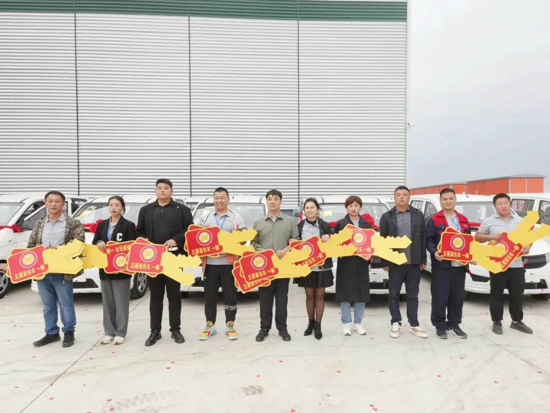 注:一等奖获奖经销商喜提五菱宏光面包车一辆后集体合影。