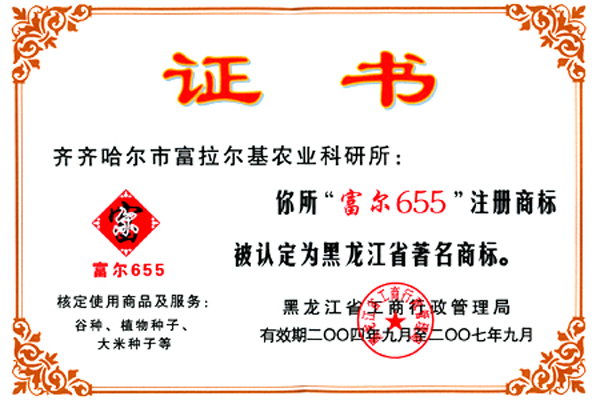2004.9月-2007.7月,“富尔655”注册商标被黑龙江省行政管理局认定为黑龙江省著名商标。