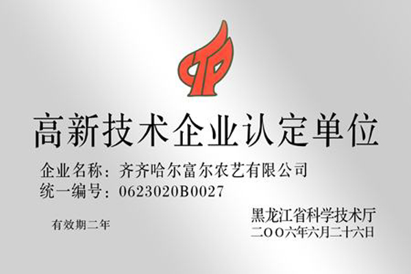 2006年6月26日,黑龙江省科学技术厅为富尔农艺有限公司颁发高新技术企业认定单奖牌。